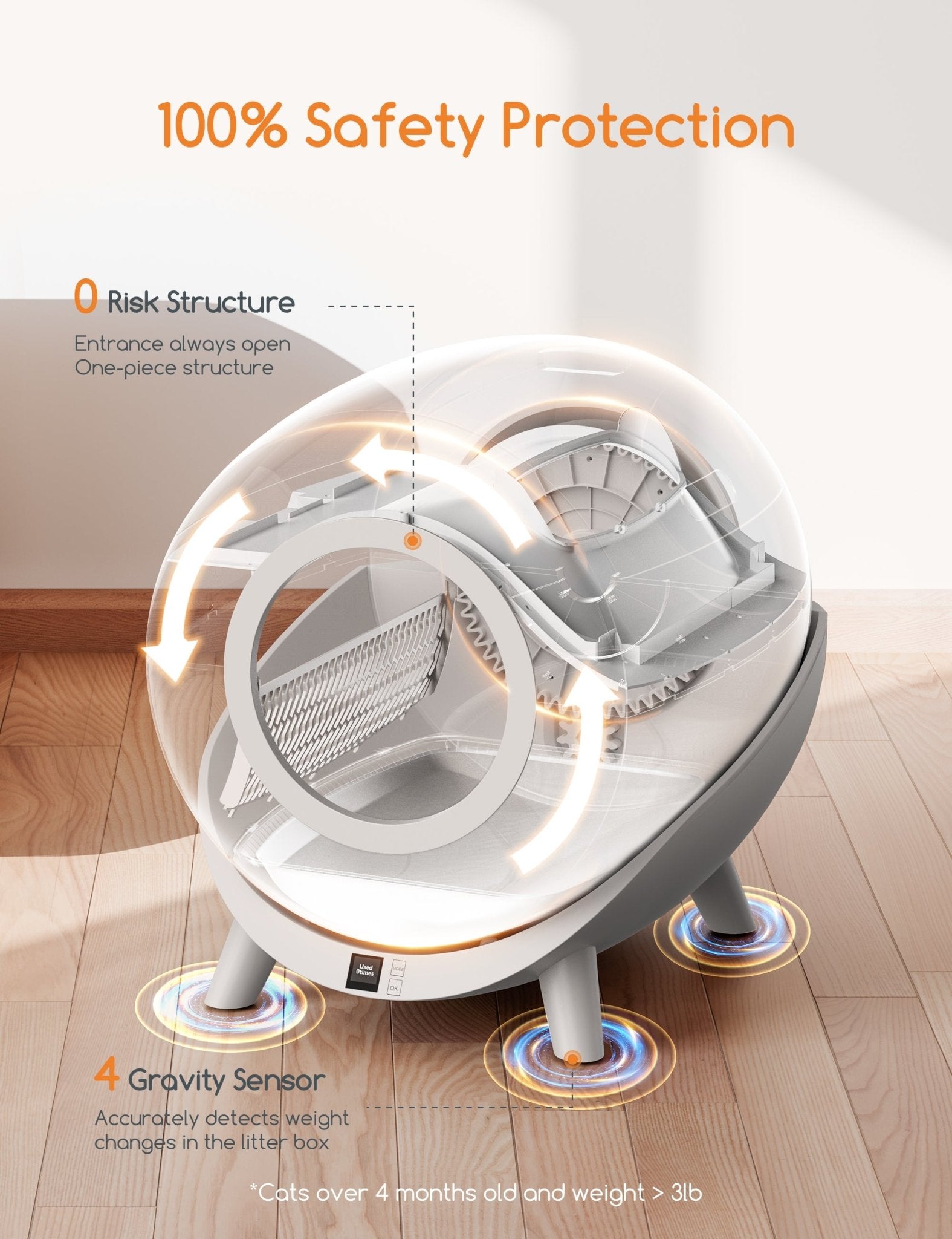 - 100% Safety protection: LB01 features an integrated design with no gaps, ensuring a safe and trap-free experience for cats. Equipped with four sensors, the machine halts immediately when a cat approaches or enters the litter box, ensuring a secure toileting experience.