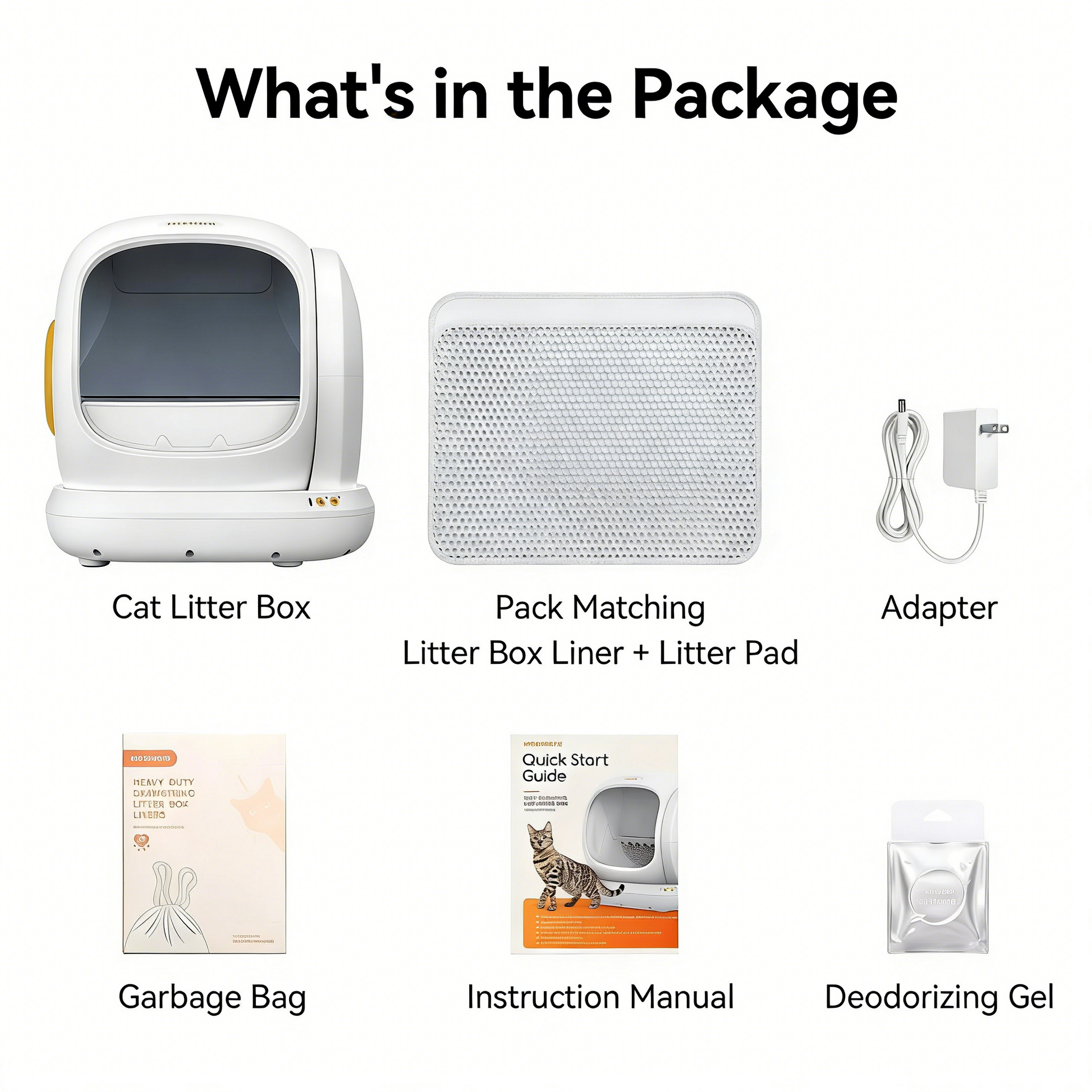 1*Cat Litter Box 1* Cat Litter Mat 1*Pee Guard 1* Power Cable 1* User Manual 1* Odor Eliminator 1*Pack Matching Litter Box Liner |