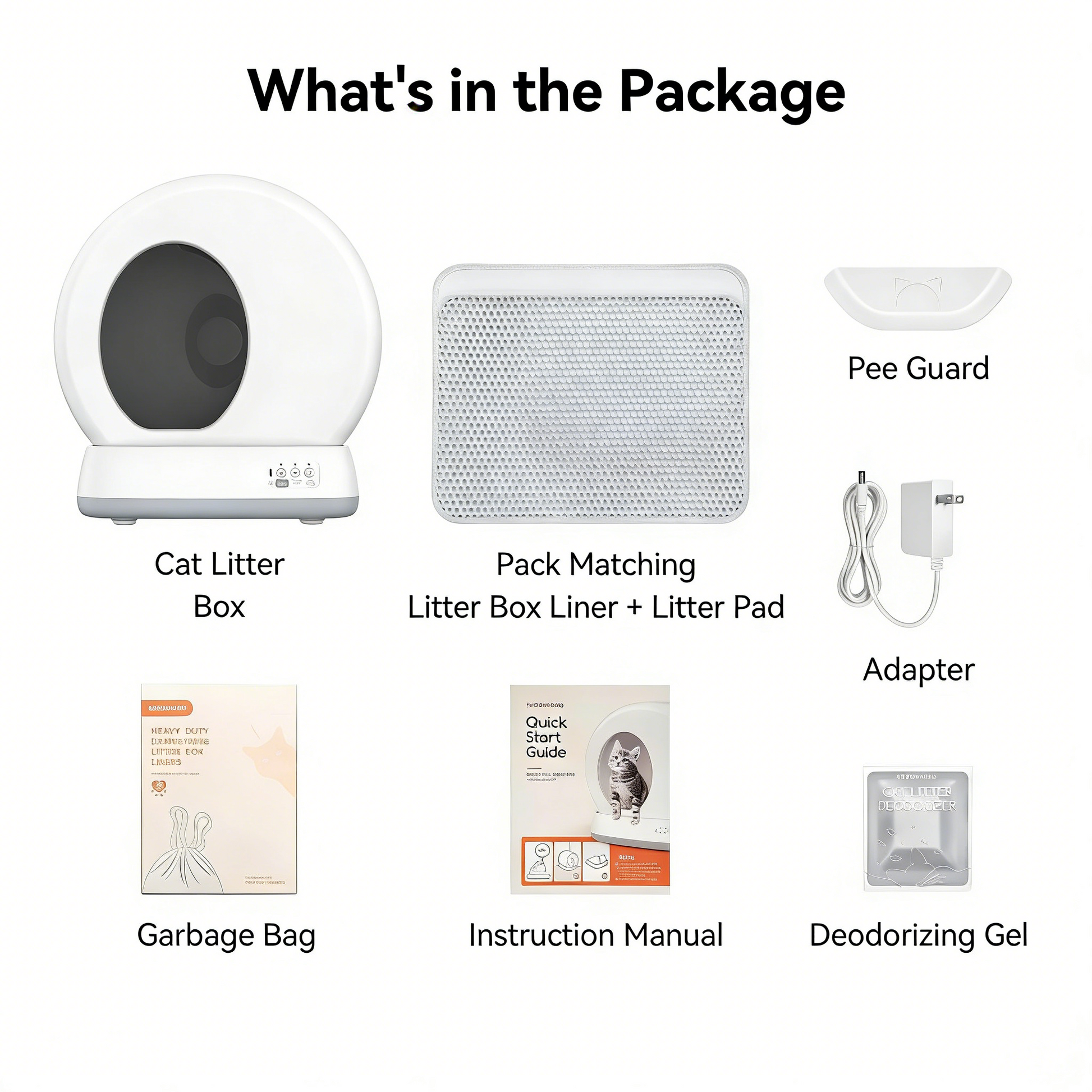 1*Cat Litter Box 1* Cat Litter Mat 1*Pee Guard 1* Power Cable 1* User Manual 1* Odor Eliminator 1*Pack Matching Litter Box Liner |